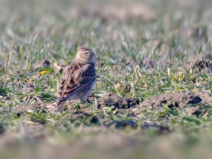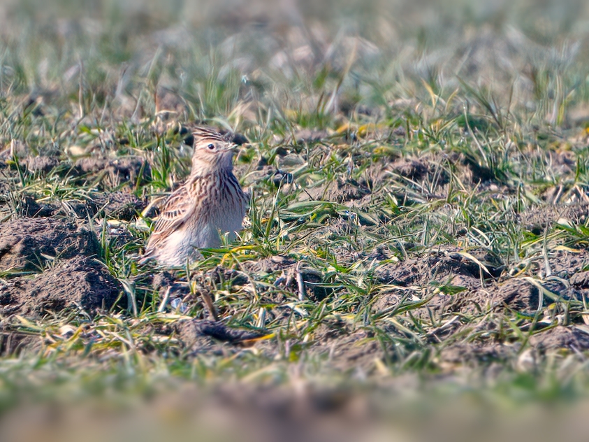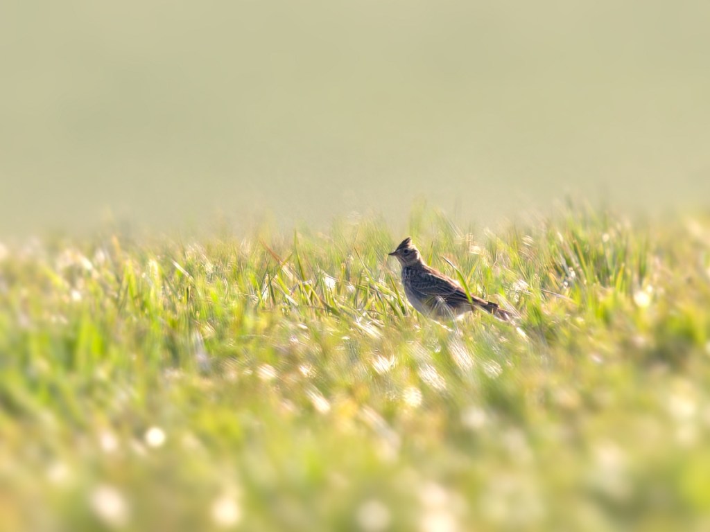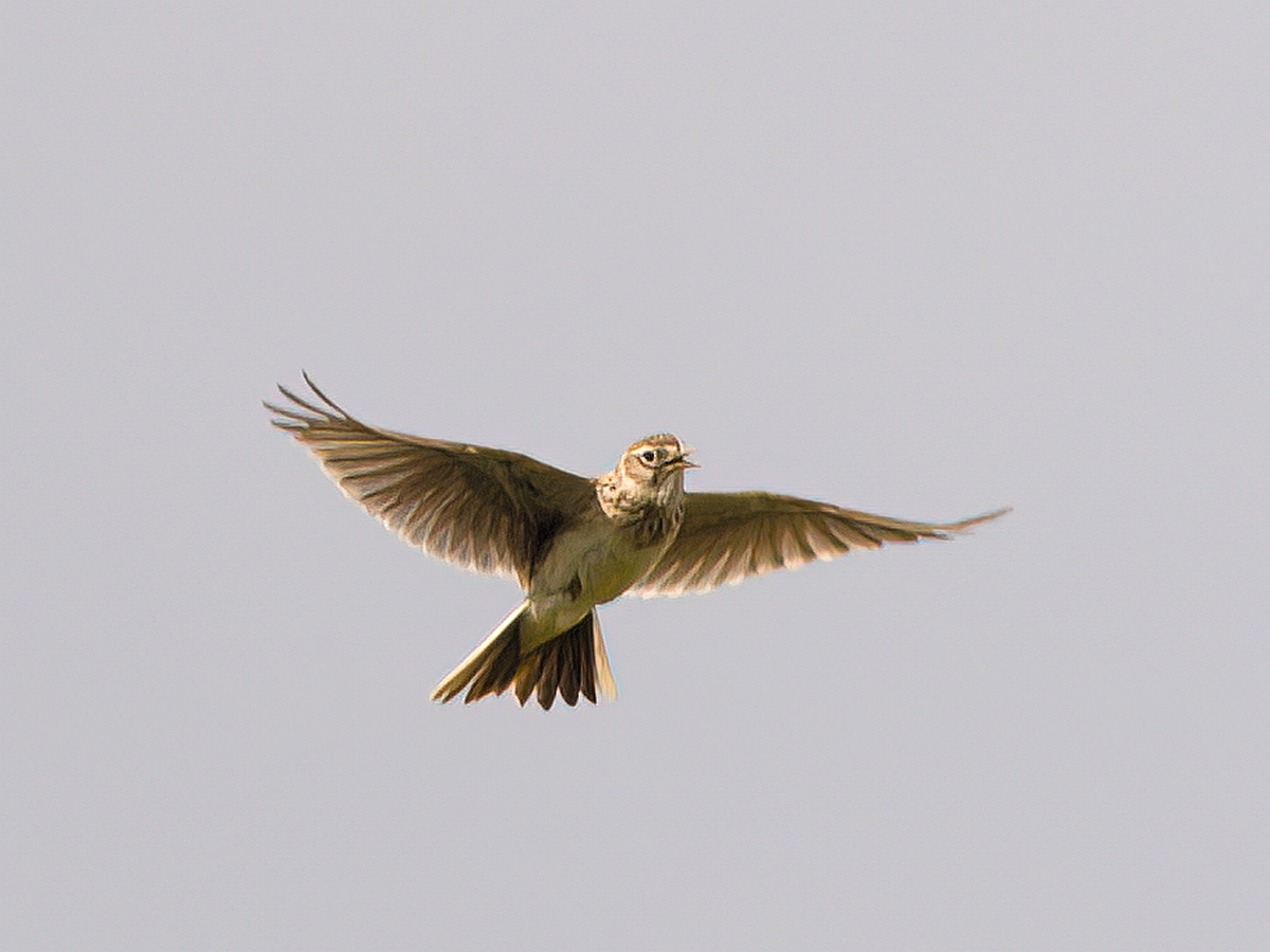 Die Feldlerche (Alauda arvensis) ist ein Kurzstreckenzieher und kann bei uns ab März beobachtet werden. Der 18-19cm (Spannweite 30-36cm) große Bodenbrüter lebt auf Feldern und Wiesen, wo er in der Brutzeit von April bis August auch sein Nest baut. Die Feldlerche hält dabei Abstand zu Bäumen und Siedlungen.