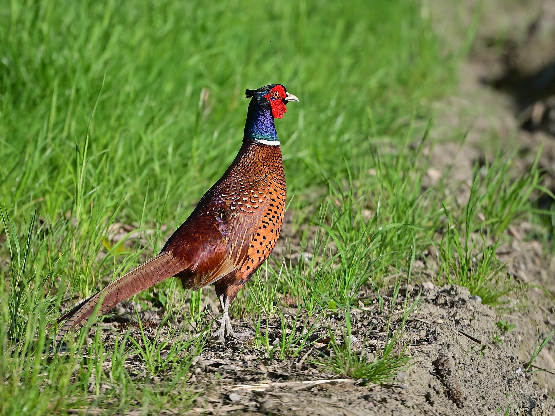 Männliche Fasane, der Typ „torquatus“ ist am weissen Halsring erkennbar (Bild links), ohne Ring vom Typ „colchicus“ (Bild rechts)