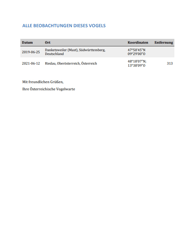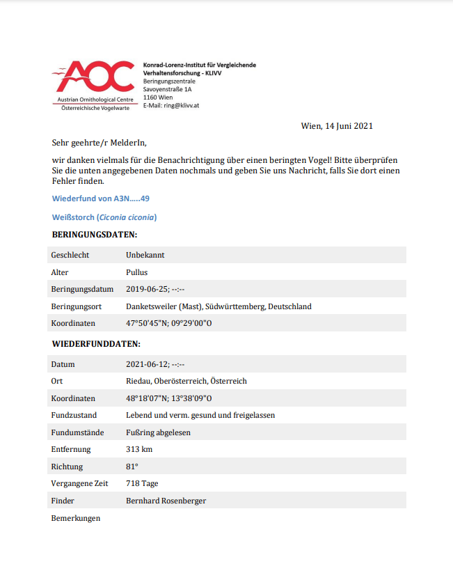 Manchmal trifft man auch auf beringte Exemplare. Wenn man die Ringdaten meldet, bekommt man meist interessante Hintergrundinformationen zugesandt (siehe Beispiel unten) .