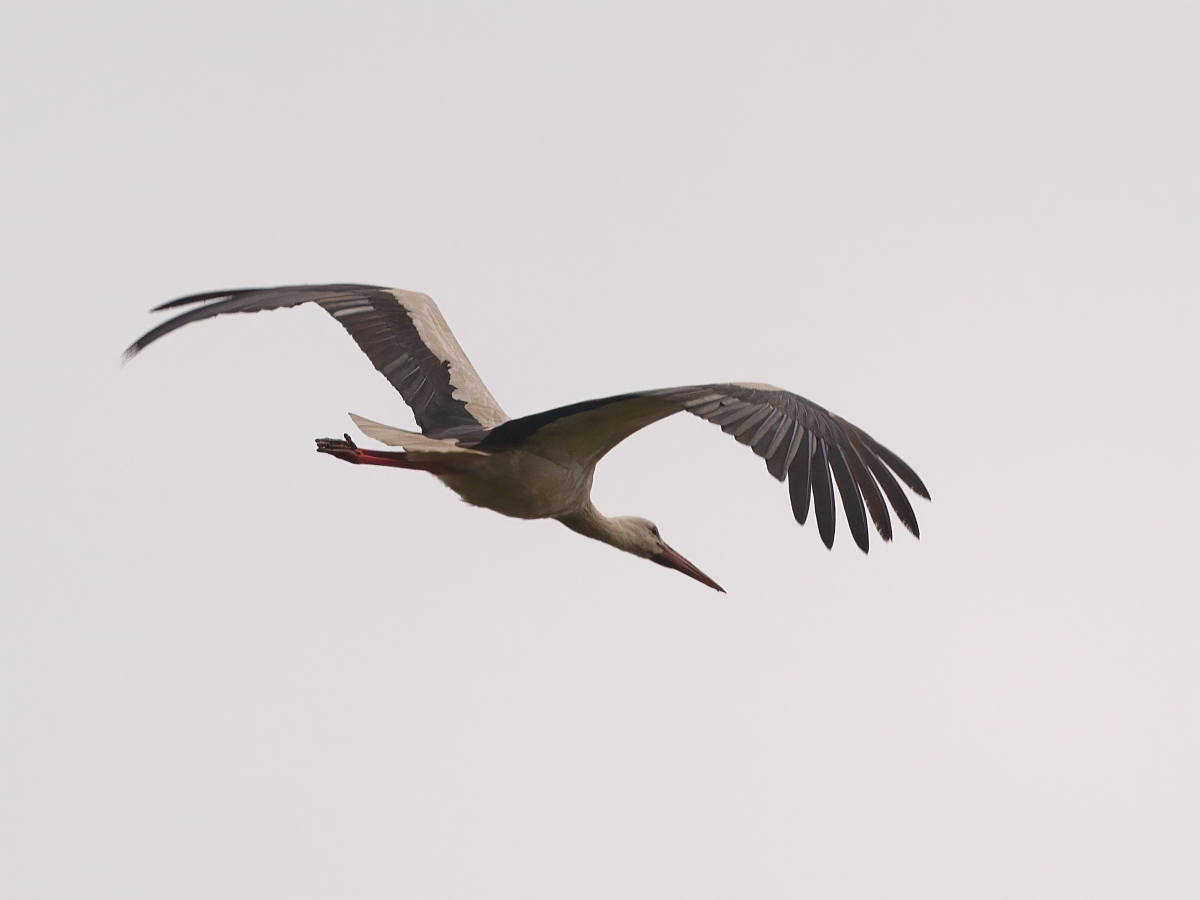 Grundsätzlich sind Weißstörche überfliegend, aber auch immer öfter bei der Nahrungssuche auf Wiesen und Feldern zu beobachten.